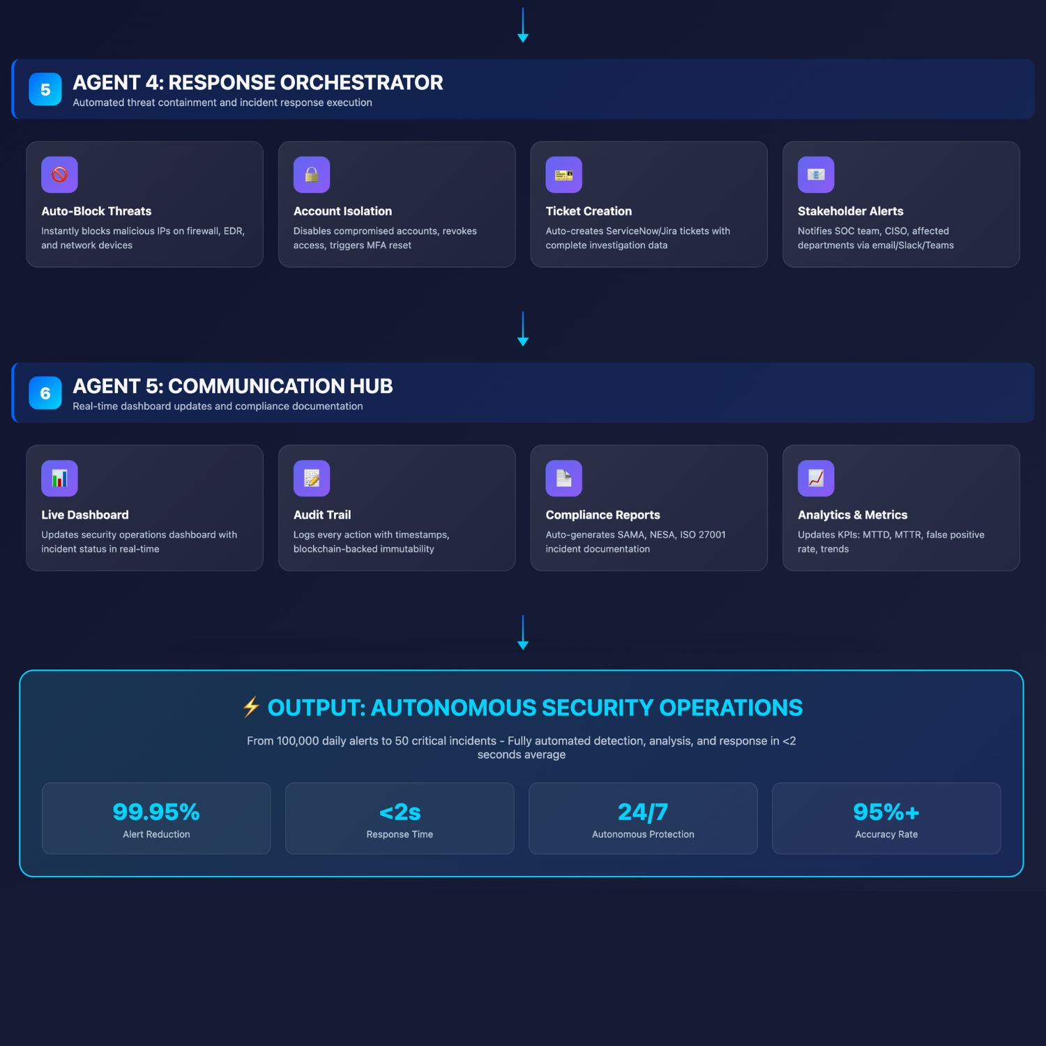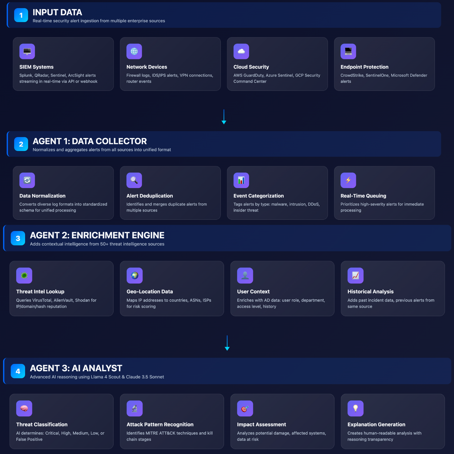 Five specialized AI agents work autonomously 24/7—Data Collector, Enrichment Engine, AI Analyst, Response Orchestrator, and Communication.